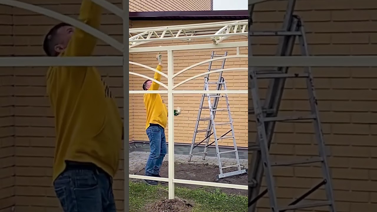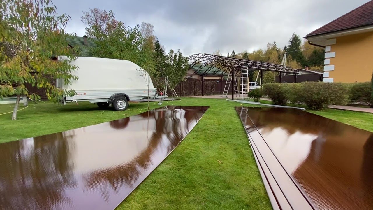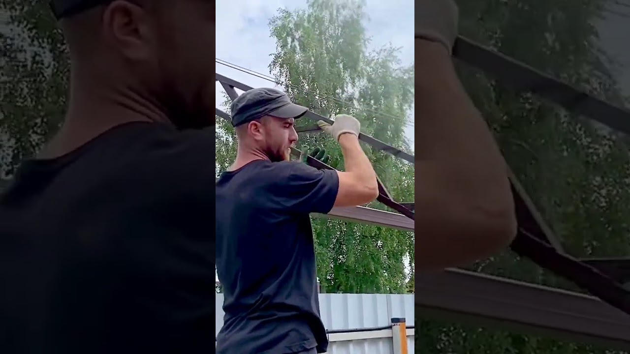 Приступили к сборке очередного комплекта навеса из поликарбоната с необычными стропильными фермами